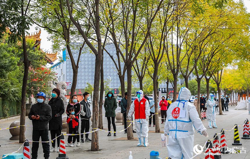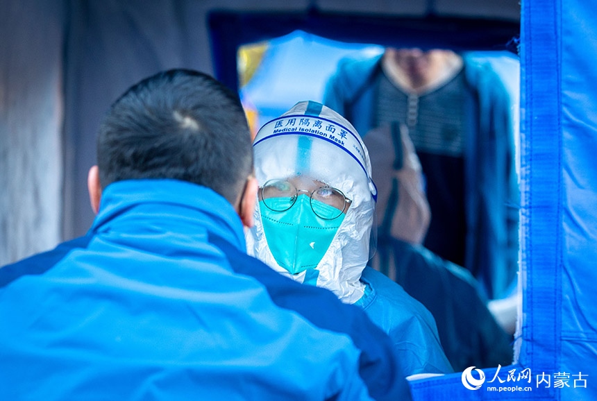 呼和浩特市玉泉區(qū)一處核酸采樣點,醫(yī)護人員為居民進(jìn)行核酸檢測。丁根厚攝