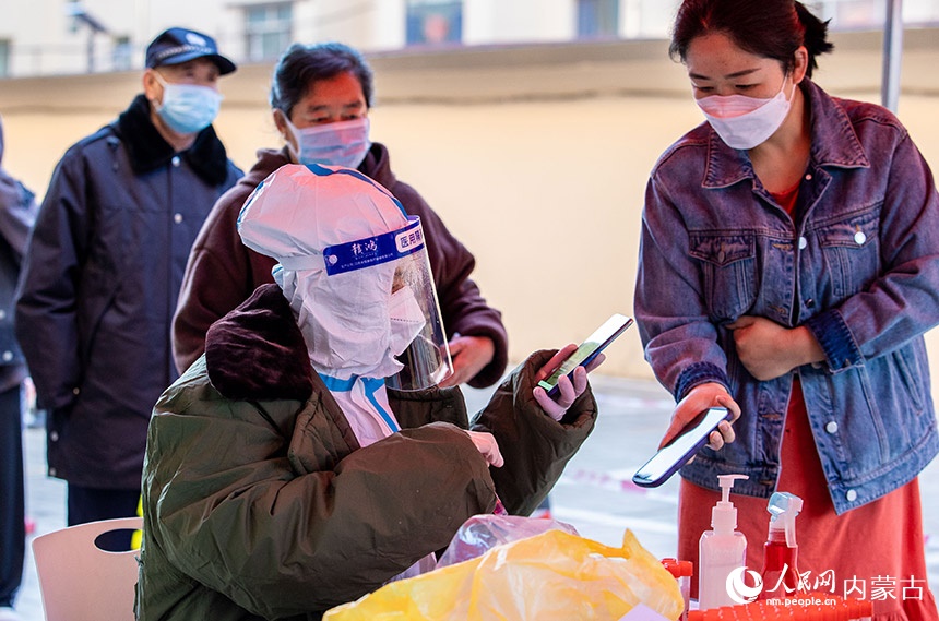呼和浩特市玉泉區(qū)一處住宅小區(qū),社區(qū)網(wǎng)格員在查驗準(zhǔn)備去核酸檢測點居民的健康碼。丁根厚攝