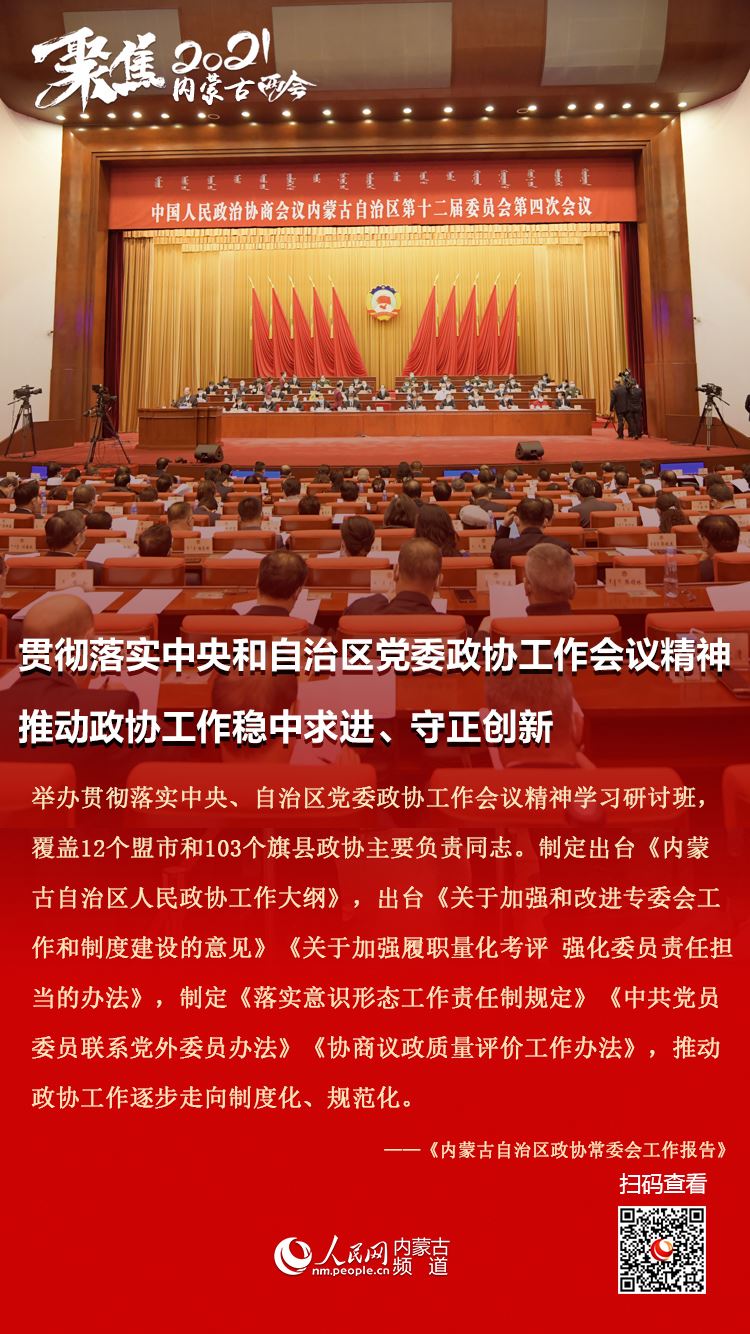 1月25日上午,自治區(qū)政協(xié)十二屆四次會議在內蒙古人民會堂隆重開幕。自治區(qū)政協(xié)主席李秀領作政協(xié)內蒙古自治區(qū)第十二屆委員會常務委員會工作報告。今年的政協(xié)常委會工作報告都有哪些亮點,2021年主要工作安排有哪些,七張圖帶您梳理!
