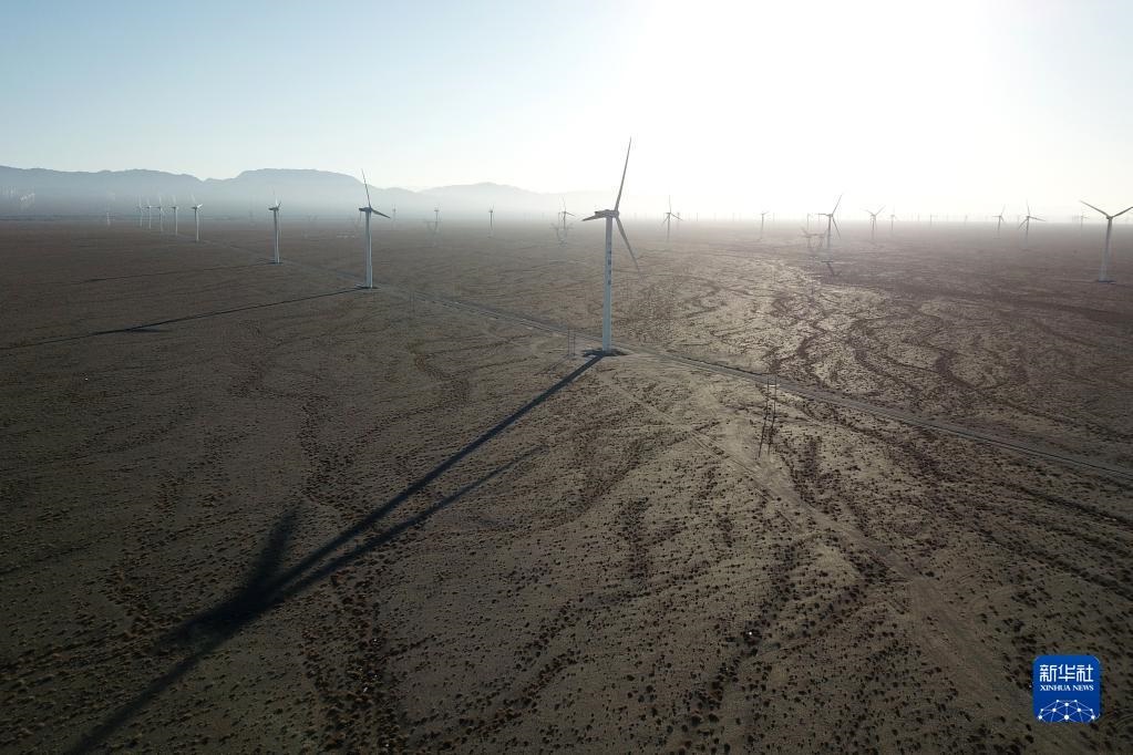 這是2021年12月8日拍攝的中節(jié)能(甘肅)風(fēng)力發(fā)電有限公司玉門昌馬風(fēng)電場的風(fēng)機(jī)(無人機(jī)照片)。新華社記者 范培珅 攝
