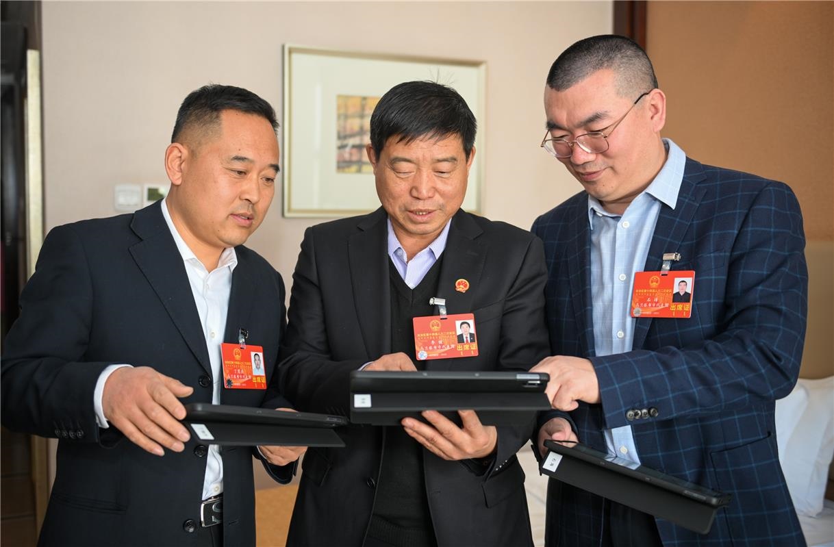 出席自治區(qū)十四屆人大二次會(huì)議的人大代表丁慧杰(左)、李俊(中)、石海認(rèn)真研讀會(huì)議材料。
