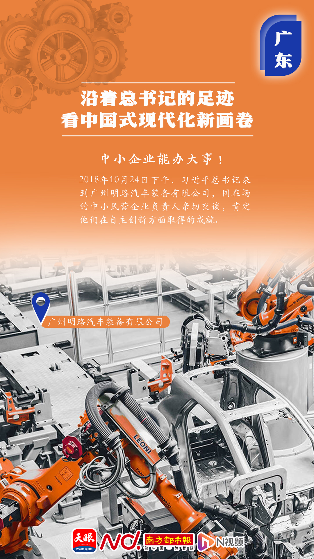 “中小企業(yè)能辦大事!”2018年10月24日下午,習(xí)近平總書記來到廣州明珞汽車裝備有限公司,同在場的中小民營企業(yè)負(fù)責(zé)人親切交談,肯定他們?cè)谧灾鲃?chuàng)新方面取得的成就。