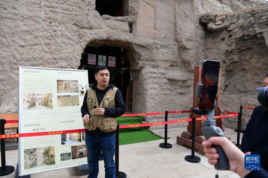 5月11日,云岡研究院工作人員孫波在云岡石窟第1窟進(jìn)行文物保護(hù)專題直播。新華社記者 楊晨光 攝
