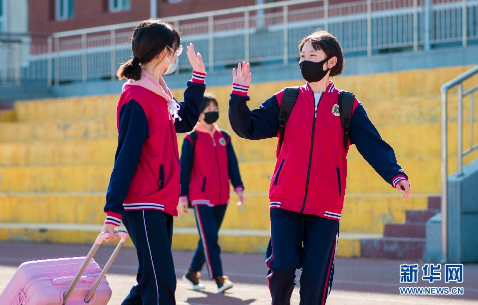 4月26日,呼和浩特市第十二中學(xué)復(fù)課,久違的同學(xué)見面后開心擊掌。新華網(wǎng)發(fā)(丁根厚 攝) 2020年4月26日,內(nèi)蒙古自治區(qū)呼和浩特市各所中學(xué)在做好疫情防控的前提下,高一、高二年級,初一、初二年級有序返校復(fù)學(xué)。這是呼和浩特第二批次學(xué)校開學(xué),高三、初三年級已于3月30日復(fù)課。 -