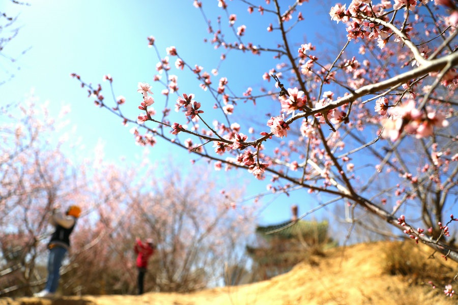 春光明媚,桃花盛開。3月28日,呼和浩特市滿都海公園,一簇簇桃花迎風綻放。